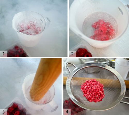 將樹莓分開。1)在液氮中放入一些覆盆子(確保足夠)。2)等待劇烈的沸騰停止-現在漿果一直被冷凍。您可以根據需要減少凍結,但是硬凍結使您的工作時間更長。3)用a面杖搗碎漿果。4)應變。