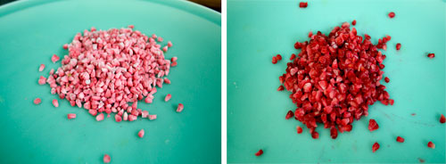 覆盆子融化前后。在融化之前不要嘗試吃它們,但要確保在它們結實的時候將它們鍍上。融化的是脆弱的。